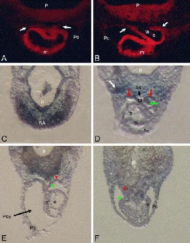 Fig. 8. Analysis of morphology and xId2 expression patterns of stage 37 Xenopus embryos following neural crest ablation and in situ hybridization (ISH) for xId2. (A, B) Transverse sections of a stage 37 control embryonic heart immunostained with the myocardial marker MF20. White arrows indicate (MF20 negative) undifferentiated splanchnic mesoderm cells continuous with the newly formed cardiac myocardial cells expressing myosin heavy chain (MF20 positive). (C, D) Sections through a stage 37 control embryo following ISH for xId2. (C) There is Id2 expression in the branchial arches (BA), and in a more caudal section (D) there is expression in the splachnic mesoderm (red arrows), myocardium of the outflow tract (green arrow), and the branchial arches (white arrow). Note that the expression in the splachnic mesoderm is continuous with the distal outflow tract myocardium. There is a visible pharynx (P), pericardium (Pc), myocardium (m), endocardium (e), aortic sac (as, black arrow), and truncus arteriosus (ta). [See Mohun et al. (2000) for reference to Xenopus heart morphology.] (E, F) Sections through a stage 37 embryo following stage 15 neural crest ablation and ISH for xId2. There is a lack of xId2 expression in both the splachnic mesoderm (red arrowheads) and myocardium of the outflow tract (green arrowheads). Morphologically, there is pericardial edema (PcE), an enlarged myocardium (m), and an irregular pericardial layer (pc). (E) The heart that formed in this ablated embryo is an unlooped linear heart tube.