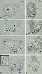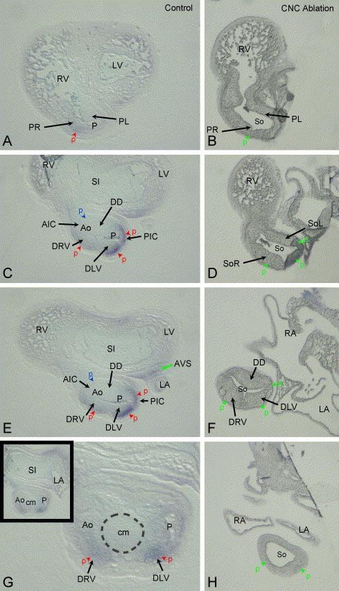 Fig. 3. Loss of chick Id2 expression in a day 5.5 heart following early cardiac neural crest ablation (3â8-somite stage). Selected sections showing chick Id2 expression in a control day 5.5 heart and a day 5.5 heart after early cardiac neural crest ablation. (A, C, E, G) Expression of Id2 from proximal to distal within the developing outflow tract and heart of a control day 5.5 heart. (B, D, F, H) Loss of Id2 expression from proximal to distal within a day 5.5 outflow tract and heart following early cardiac neural crest ablation. (H) Early cardiac neural crest ablation resulted in a single outflow vessel (So) with no septation or cardiac neural crest derived condensed mesenchyme (cm). Red p and arrowhead, prong of cardiac neural crest (CNC) with Id2 expression. Blue p and arrowhead, prong of CNC with no Id2 expression. Green p and arrowhead, loss of CNC prong and Id2 expression after early CNC ablation. RV, right ventricle; LV, left ventricle; RA, right atrium; LA, left atrium; Ao, aorta; P, pulmonary trunk; PR, proximal right endocardial cushion; PL, proximal left endocardial cushion; SI, septum intermedium; DD, distal dorsal endocardial cushion; AIC, aorta intercalated endocardial cushion; PIC, pulmonary intercalated endocardial cushion; DRV, distal right ventral endocardial cushion; DLV, distal left ventral endocardial cushion; AVS, atrioventricular sulcus; So, single outflow vessel; SoR, single outflow vessel right endocardial cushion; SoL, single outflow vessel left endocardial cushion. OFT labeling based on that of Qayyum et al. (2001).