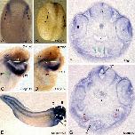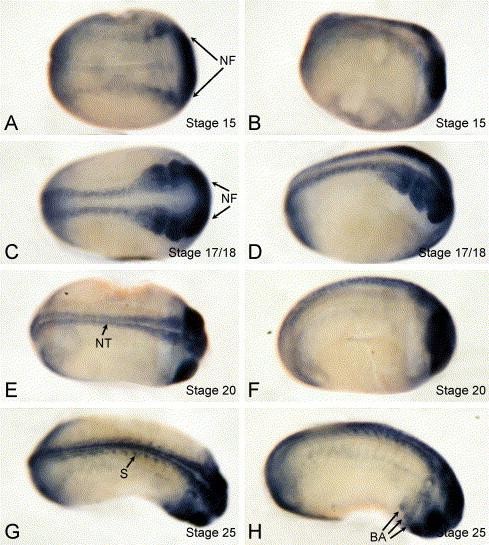 Fig. 5. xId2 expression in staged Xenopus embryos. A, C, E, and G are dorsal views with the anterior of the embryo to the right. B, D, F, and H are right lateral views of the embryos. (AâF) Whole-mount in situ hybridization for xId2 shows expression in the neural folds (NF) and along the length of the closing neural tube (NT). (G, H) shows xId2 expression in the somites (S) and branchial arches (BA).