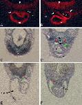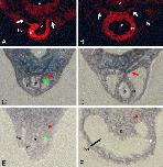 Fig. 7. Analysis of the heart morphology and xId2 expression patterns of stage 33 Xenopus embryos, following neural crest ablation and in situ hybridization (ISH) for xId2. (A, B) Transverse sections of a stage 33 control embryonic heart immunostained with the myocardial marker MF20. White arrows indicate (MF20 negative) undifferentiated splanchnic mesoderm cells continuous with the newly formed cardiac myocardial cells expressing myosin heavy chain (MF20 positive). (C, D) Sections through a stage 33 control embryo following ISH for xId2. In the control embryos, there is a visible myocardium (m), endocardium (e), and pharynx (P). [See Mohun et al. (2000) for reference to Xenopus heart morphology.] There is xId2 expression in the splachnic mesoderm (red arrows) as well as the outflow track myocardium (green arrow). (E, F) Sections through a stage 33 embryo following stage 15 neural crest ablation and ISH for xId2. There is a lack of xId2 expression in the splachnic mesoderm (red arrowheads) and the outflow tract myocardium (green arrowhead). There are also morphological differences in heart development following neural crest ablation. Note the enlarged myocardium (m), the thickened pericardial layer (Pc), and the pericardial edema (PcE). Morphology is variable among neural crest ablated embryos; (E) sometimes there is visible formation of a myocardium (m) and endocardium (e), (F) whereas in other embryos there is only an undistinguishable mass of heart cells (h).