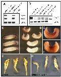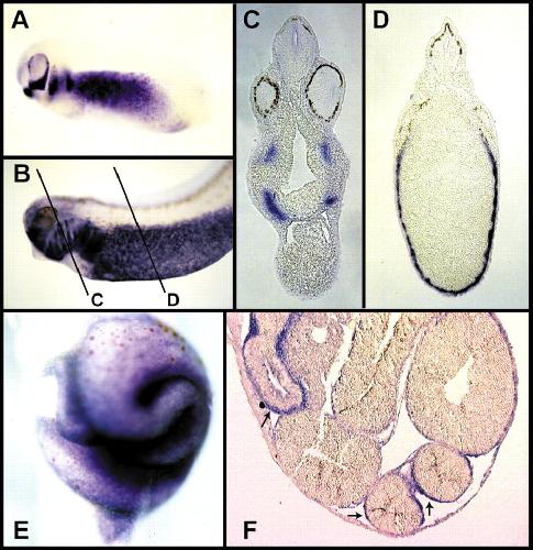 Fig. 1. Expression of FoxF1 during Xenopus development. (A,B) Embryos are shown with anterior to the left and dorsal to the top. (A) Whole-mount in-situ hybridization of a FoxF1 probe to a stage-25 embryo. FoxF1 expression is present in the neural crest-derived structures of the head and in the lateral plate mesoderm. At stage 30 the expression of FoxF1 intensifies and is also present in the ventralmesoderm (B). Letters with lines in (B) indicate the position of sections in (C,D). (C) Section through the head, branchial arches, and heart regions shows the lack of FoxF1 expression in the heart. (D) Section through the mid-trunk region of the embryo shows expression in the lateral plate mesoderm. (E) Ventral view of whole-mount in-situ hybridization of a stage-45 embryo shows FoxF1 expression in the gut. (F) Transverse section through the embryo shown in (E) demonstrates that FoxF1 transcripts are present in the splanchnic mesoderm (arrow).