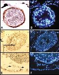 Fig. 3. FoxF1 is required for smooth muscle differentiation in the gut. Immunostaining with antibodies against α-smooth muscle actin on transverse sections through the hindgut of CoMo (A) and FoxF1 knockdown (C) embryos at stage 43/44. α-smooth muscle actin is expressed in the smooth muscle layer surrounding the gutendoderm (A) but absent in the knockdown embryo (C). (B,D) Nuclear staining by Hoechst dye on the same sections shows a layer of smooth muscle cells with elongated nuclei (arrows) surrounding the gut of CoMo-injected embryos (B), but highly disorganized gutmesoderm in knockdown embryos (D). (E) Close-up view of the area boxed in (C), visualizing the endodermal yolk platelets (arrows) in the visceral cavity.