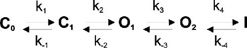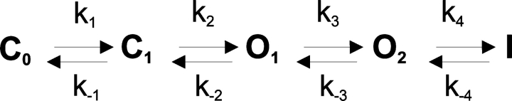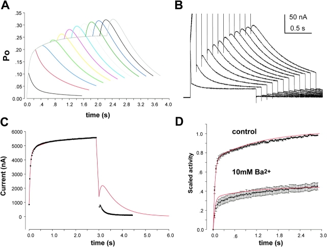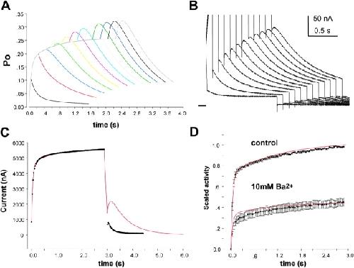 Figure 13. . Simulation of KCNQ1 gating. (A) Simulation of the tail envelope protocol as described in Fig. 12. The simulation was done according to Scheme I. All rate constants represent averaged values obtained from the least square fit of currents at +30 mV and −60 mV in the absence of Ba2+ (n = 7). The ordinate represents the calculated open probability (fractional occupancy of the open states). (B) Representative experimental traces of the tail envelope protocol. (C) Simulation (red line) of KCNQ1 activation (+30 mV) and deactivation (−60 mV) according to Scheme I, superimposed on an experimental trace. (D) Scaled simulation (red lines) of KCNQ1 activation in high external K+ (50 mM) according to Scheme II, in the absence and presence of 10mM Ba2+. The simulation was superimposed on experimental average traces obtained from seven oocytes.