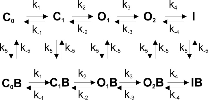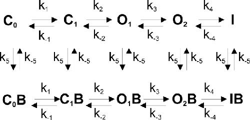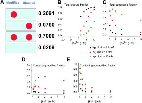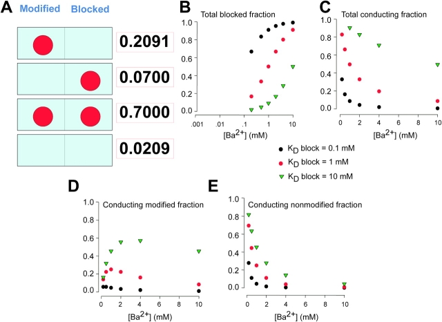 Figure 14. . Schematic calculation of KCNQ1 channel distribution among different populations in the presence of Ba2+. (A) Diagram of the different channel populations in the presence of 10 mM Ba2+, assuming a KD = 3 mM for channel block and a KD = 1 mM for channel gating modification. It is assumed that external Ba2+ interact with the permeation pathway of KCNQ1 channels at two distinct and nonsequential sites. (1) A deep site that accounts for the voltage-dependent block of the pore and leads to blocked nonconducting channels. (2) A superficial site that modifies the gating transitions states of KCNQ1 and leads to modified-conducting channels. (B–E) Illustration of how the relative fractions of nonconducting (blocked), and conducting (modified and nonmodified) channels are predicted to evolve, depending on the KD values for Ba2+ block.