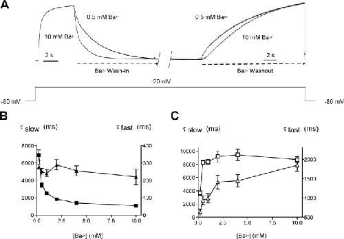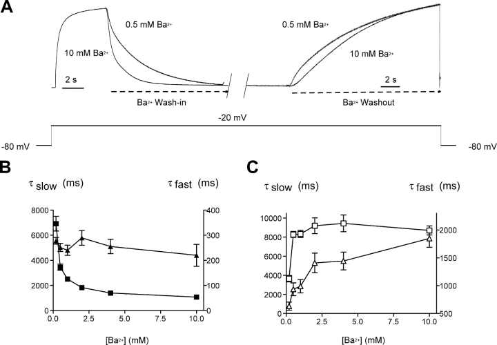 Figure 1. . Concentration dependence of Ba2+ wash-in and washout kinetics. The kinetic experiments were performed with various extracellular Ba2+ concentrations at −20 mV in low external K+ solutions (2 mM). (A) Representative normalized traces are shown. From a holding potential of −80 mV, the KCNQ1 channels were opened by a −20-mV depolarizing step. After 4 s of channel opening, 0.5 mM or 10 mM Ba2+ was applied for 20 s and thereafter washed out for 16 s at the same depolarizing potential (−20 mV). (B) Ba2+ wash-in kinetics were fitted by a double exponential function with a fast (solid triangles) and slow (solid squares) time constants plotted as a function of Ba2+ concentrations (n = 8). (C) Ba2+ washout kinetics were fitted by a double exponential function with a fast (empty triangles) and slow (empty squares) time constants plotted as a function of Ba2+ concentrations (n = 8).