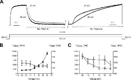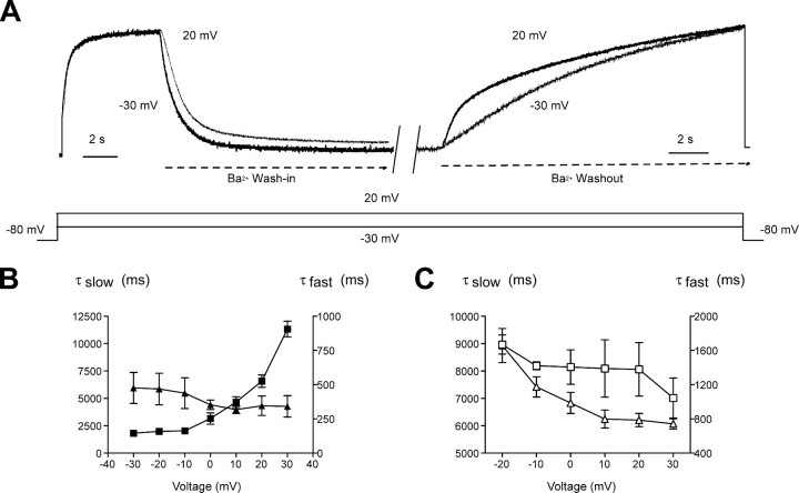 Figure 2. . Voltage dependence of Ba2+ wash-in and washout kinetics. The kinetic experiments were performed with 10 mM Ba2+ at various depolarizing voltages in low external K+ solutions (2 mM). (A) Representative normalized traces are shown. From a holding potential of −80 mV, the KCNQ1 channels were opened at −30 or +20 mV. After 4 s of channel opening, 10 mM Ba2+ was applied for 20 s and thereafter washed out for 16 s at the same depolarizing potential. (B) Ba2+ wash-in kinetics were fitted by a double exponential function with a fast (solid triangles) and slow (solid squares) time constants plotted as a function of depolarizing voltages (n = 5). (C) Ba2+ washout kinetics were fitted by a double exponential function with a fast (empty triangles) and slow (empty squares) time constants plotted as a function of depolarizing voltages (n = 5).