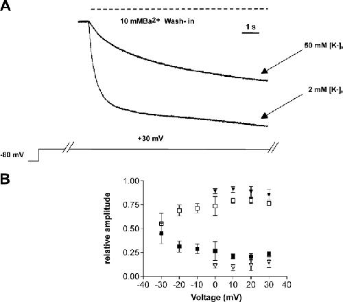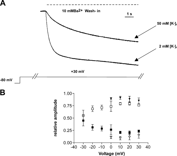 Figure 3. . Comparison of Ba2+ wash-in kinetics in low and high external K+ solutions. (A) Representative normalized traces of Ba2+ wash-in kinetics performed on the same oocyte in 2 mM [K+]0 and in 50 mM [K+]0. From a holding potential of −80 mV, the KCNQ1 channels were opened by a +30-mV depolarizing step. After 4 s of channel opening, 10 mM Ba2+ was applied for 20 s and thereafter washed out for 16 s at the same depolarizing potential (+30 mV). (B) Relative amplitudes of Ba2+ wash-in fast (empty symbols) and slow (solid symbols) kinetic components in 2 mM [K+]0 (squares) and in 50 mM [K+]0 (triangles) plotted as a function of membrane voltage.