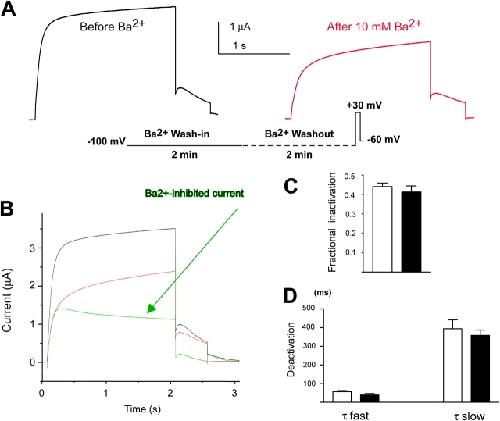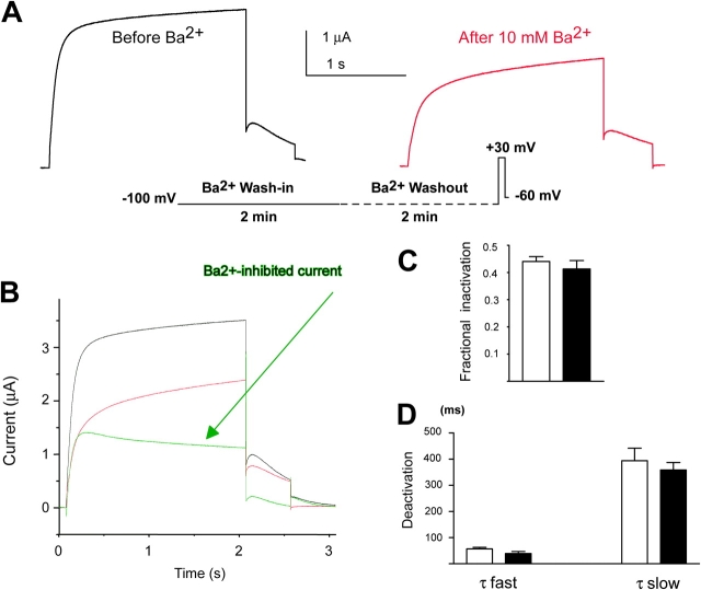 Figure 4. . Effect of barium exposure to closed KCNQ1 channels. (A) Representative traces where from a −100 mV holding potential, KCNQ1 channels were opened for 2 s at +30 mV and repolarized for 0.5 s to a −60-mV tail potential (left trace, before Ba2+); then, 10 mM Ba2+ was bound for 2 min to closed channels at −100 mV and subsequently washed out for 2 min at −100 mV, before channels were opened for 2 s at +30 mV as above (right trace, after 10 mM Ba2+). (B) Superimposed traces showing KCNQ1 current before Ba2+ exposure (black trace), after 10 mM Ba2+ (red trace), and the subtracted trace (green) corresponding to the Ba2+-inhibited current. (C) Fractional inactivation measured from the tail currents at −60 mV, before (empty bars) and after 10-mM Ba2+ application (solid bars) as described in A (n = 8). (D) Fast and slow deactivation time constants measured from the tail currents at −60 mV, before (empty bars) and after 10-mM Ba2+ application (solid bars) as described in A (n = 8).