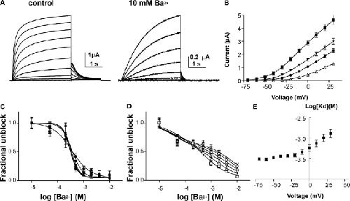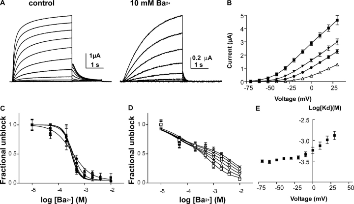 Figure 5. . Barium produces a concentration- and voltage-dependent channel block. (A) Representative KCNQ1 current traces recorded in the absence (control) or presence of 10 mM Ba2+. From a holding potential of −80 mV, oocytes were stepped for 3 s from −70 to +30 mV in 10-mV increments and then repolarized for 1.5 s at −60-mV tail potential. (B) Current-voltage relations (n = 7) of control (solid squares), 0.5 mM Ba2+ (solid triangles), 2 mM Ba2+ (solid circles), and 10 mM Ba2+ (empty triangles). (C) Ba2+ inhibitory curves expressed as fractional channel unblock versus log10 of Ba2+ concentrations and measured at −70 mV (closed squares), −60 mV (upward closed triangles), −50 mV (downward closed triangles), −40 mV (closed diamonds), and −30 mV (closed circles). The KD values were obtained from the fit of a sigmoidal dose–response function (n = 7). (D) Ba2+ inhibitory curves expressed as in C and measured at −20 mV (open squares), −10 mV (upward open triangles), 0 mV (downward open triangles), +10 mV (open diamonds), +20 mV (open circles), and +30 mV (X labels). The KD values were obtained from the fit of a two site competition function. (E) Semilogarithmic plot of the KD values obtained from one site fit of the Ba2+ inhibitory curves versus membrane voltage (n = 7).