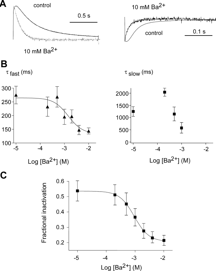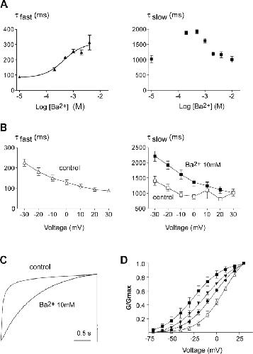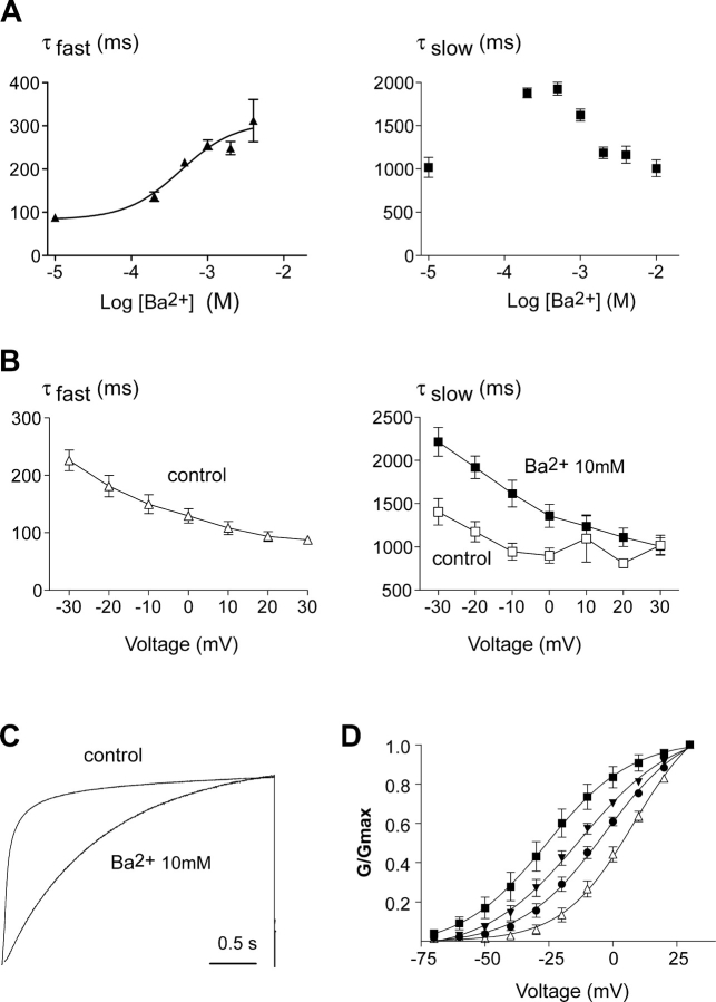 Figure 6. . Effect of Ba2+ on activation gating. (A) Activation kinetics at +30 mV were fitted by a double exponential function, with a fast (left) and slow time constant (right), plotted as a function of external Ba2+ concentrations (n = 10). A sigmoidal dose–response function yielded an EC50 = 0.44 mM for the fast time constant. (B) The fast (left) and slow (right) activation time constant (n = 11) were plotted against voltage steps and were measured in the absence (empty symbols) or the presence of 10mM Ba2+ (solid squares). (C) Representative normalized traces of current recorded at +30 mV before (control) and after application of 10 mM Ba2+. (D) The normalized conductance, deduced from the tail currents was plotted as a function of step voltage for control (closed squares), 0.5 mM Ba2+ (solid triangles), 2 mM Ba2+ (closed circles), and 10 mM Ba2+ (empty triangles). The normalized conductance curves were fitted using a Boltzmann function.