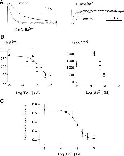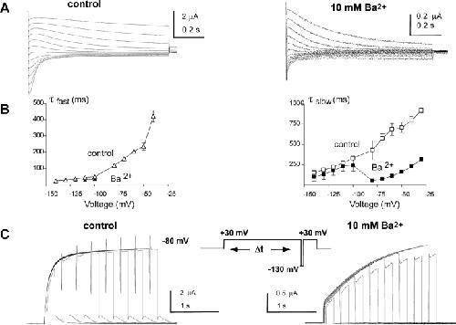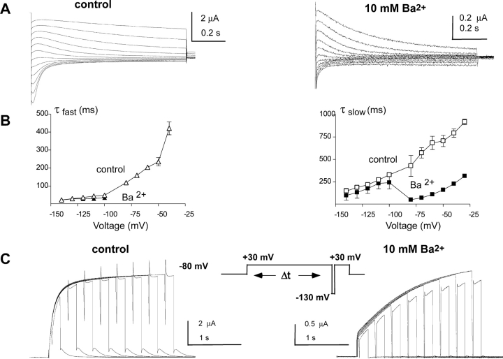 Figure 8. . Effect of barium on time-dependent inactivation and voltage-dependent deactivation kinetics. (A) Representative tail currents obtained after a 1.5-s prepulse at +30 mV from −140 to −30 mV in 10-mV increments before (left) and after (right) application of 10 mM Ba2+. (B) The deactivation kinetics were determined in the absence (control) or presence of 10 mM Ba2+ at various tail potentials following a 1.5-s prepulse at +30 mV and were fitted by a double exponential function, with a fast (left) and slow (right) time constant (n = 5). (C) Representative current traces (n = 7) where the membrane potential was stepped to +30 mV for increasing durations by increments of 200 ms to progressively activate and inactivate the channel; then, a brief (15 ms) hyperpolarizing interpulse to −130 mV was used to allow channel recovery from inactivation before a +30-mV test pulse was applied to reopen and reinactivate KCNQ1 channels. The decaying current of the third test pulse (reinduction of inactivation) could be fitted by a single exponential function.