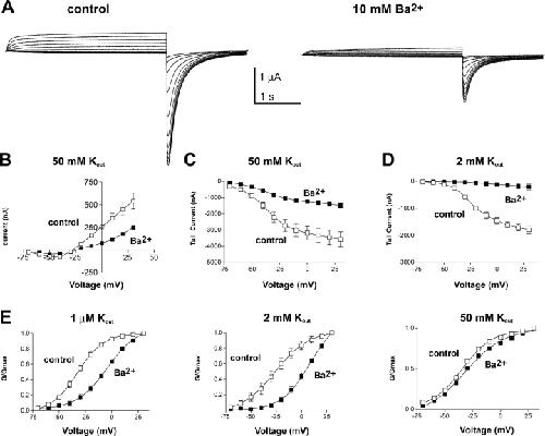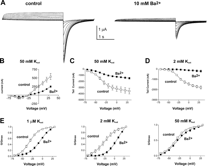 Figure 9. . Barium effects in high external K+ solutions. (A) Representative KCNQ1 current traces recorded in high external K+ (50 mM) solution, in the absence (left) or presence (right) of 10 mM Ba2+. From a holding potential of −80 mV, oocytes were stepped for 3 s from −70 to +30 mV in 10-mV increments and then repolarized for 1.5 s at −120-mV tail potential. (B) Current-voltage relations (n = 8) before (control, empty squares) and after application of 10 mM Ba2+ (solid squares) measured at steady-state in high external K+ (50 mM). (C) Current-voltage relations of the same experiments as in B (n = 8), before (control, empty squares) and after application of 10 mM Ba2+ (solid squares) measured at −120 mV tail potential in high external K+ (50 mM). (D) Current-voltage relations (n = 7), before (control, empty squares) and after application of 10 mM Ba2+ (solid squares) measured at −120-mV tail potential in low external K+ (2 mM). (E) The normalized conductance, deduced from the tail currents at −120 mV, was measured before (control, open squares) and after application of 10mM Ba2+ (solid squares) in 1 μM (left), 2 mM (middle), and 50 mM (right) external K+. The normalized conductance curves were fitted using a Boltzmann function.