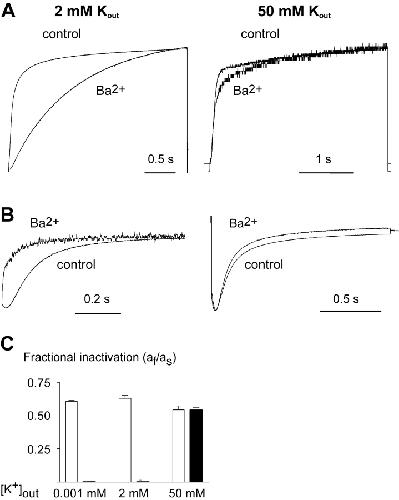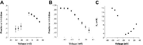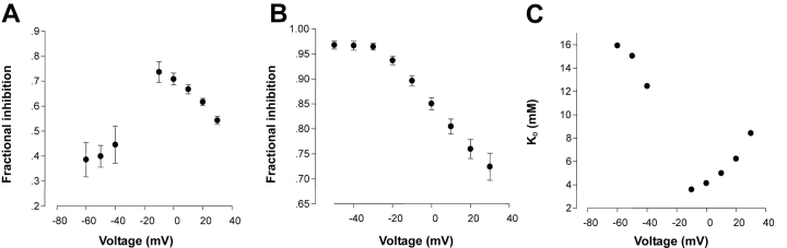 Figure 11. . Effect of membrane voltage on the fractional current inhibition produced by barium. (A) Fractional current inhibition produced by 10 mM Ba2+ in high external K+ (50 mM) and plotted as a function of step voltages. (B) Fractional current inhibition produced by 10 mM Ba2+ in low external K+ (2 mM) and plotted as in A. (C) Extraction of the Ba2+ KD values from the fractional current inhibition (see materials and methods) and plotted a function of step voltages.