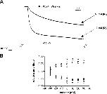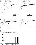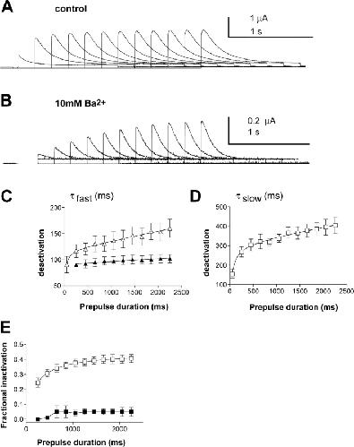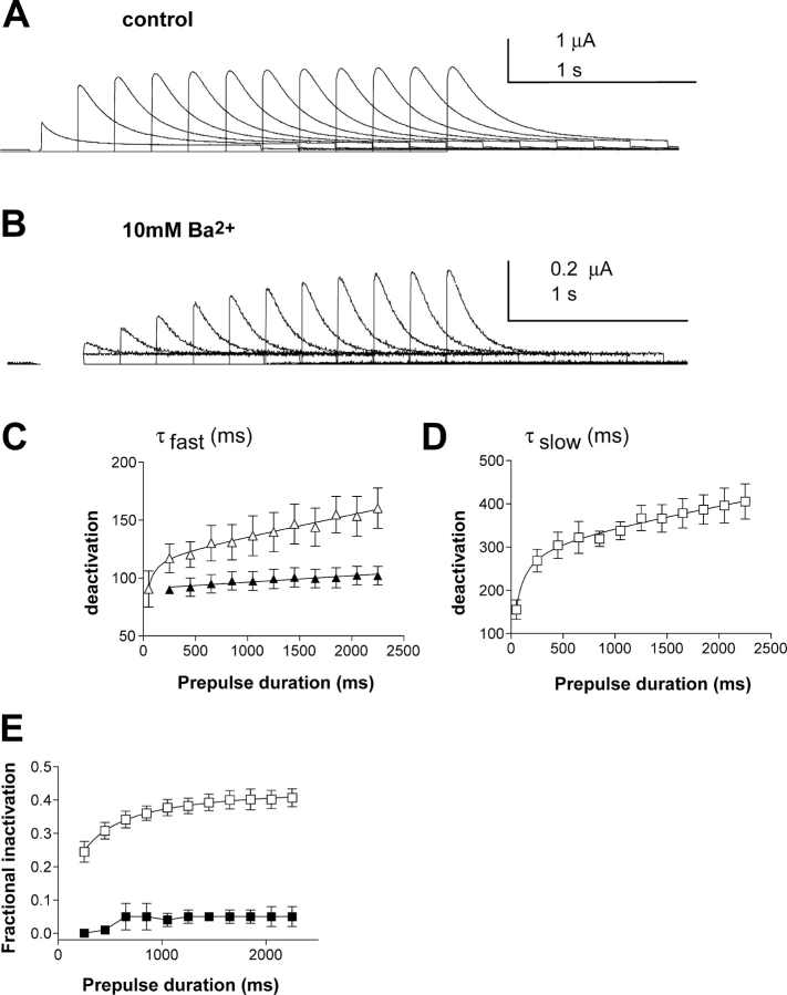 Figure 12. . Effect of Ba2+ on tail current analysis. (A and B) Representative tail envelopes from the same oocyte showing the kinetics of current deactivation, measured at a −60 mV tail potential after the progressive activation of KCNQ1 channels by various prepulse durations to +30 mV from 50 ms to 2.25 s in 200-ms increments, in the absence (A) and presence of 10 mM Ba2+ (B). (C and D) Fast and slow time constant of channel deactivation before (empty symbols) and after 10-mM Ba2+ application (solid triangles) plotted as a function of prepulse duration (n = 12). (E) Fractional inactivation measured from the same tail current analysis before (empty squares) and after 10-mM Ba2+ application (solid squares) plotted as a function of prepulse duration (n = 12).