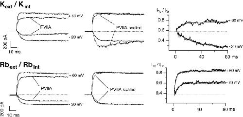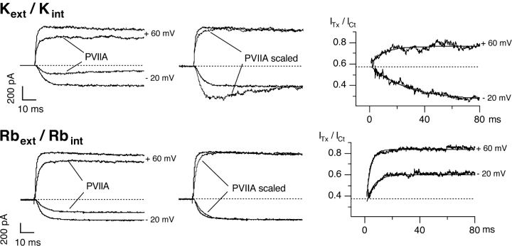 Figure 1. . κ-PVIIA blocks Shaker currents differently in symmetrical K+ and Rb+. (Left) Current responses to voltage steps from a holding potential of −100 mV to −20 and +60 mV, under control conditions and with 200 nM κ-PVIIA in symmetrical K+ (top) and 500 nM κ-PVIIA in symmetrical Rb+ (bottom). (Middle) Current in toxin is scaled to the control to evidence the effect of the toxin. Note that besides a reduction in the current amplitude, also a modification in the kinetics of the current is observed. (Right) Ratio between the toxin and control current traces. The dotted lines correspond to the tonic unblock for closed state, respectively 0.58 in K+ and 0.37 in Rb+, corresponding to a KC of 265 nM and 293 nM, respectively. The single exponential fits are superimposed to the traces: in symmetrical K+ (top) at +60 mV, τ = 9.56 ms and U = 0.76; at −20 mV, τ = 27.2 ms and U = 0.26. In symmetrical Rb+ (bottom) at +60 mV, τ = 4.6 ms and U = 0.87; at −20 mV, τ = 5.65 ms and U = 0.60.