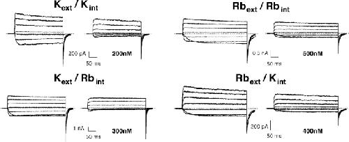 K+ channels close more slowly in the presence of external K+ and Rb+.