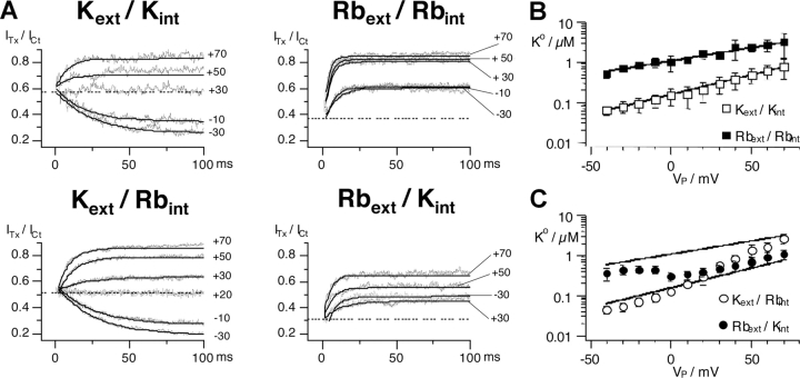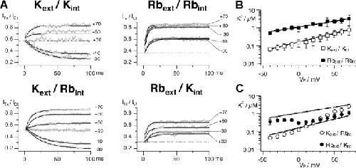 Figure 3. . Relaxation of κ-PVIIA block of Shaker currents depends on the permeant cation, Rb+ or K+. (A) Ratios between toxin and control current traces from the IV experiments in Fig. 2 from IV protocols (VH = −100 mV, VP from −50 mV to +70 mV, every 20 mV) in different ionic conditions (symmetrical K+ with 200 nM κ-PVIIA, symmetrical Rb+ with 500 nM, Kext/Rbint with 300 nM, and Rbext/Kint with 400 nM). (B) Semilogarithmic plot of the mean values ± SD of the dissociation constants (KO) versus test potential for symmetrical K+ (empty squares) or symmetrical Rb+ (filled squares). The continuous lines correspond to the exponential fit with KO(V) = KO (0)*exp(−V/vs), with KO = 146 nM at 0 mV and vs = 43 mV for symmetrical K+ and 1023 nM and vs = 76 mV for symmetrical Rb+. (C) KO versus Vp for Kext/Rbint and Rbext/Kint together with the fits from B.