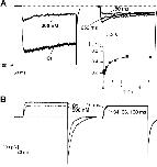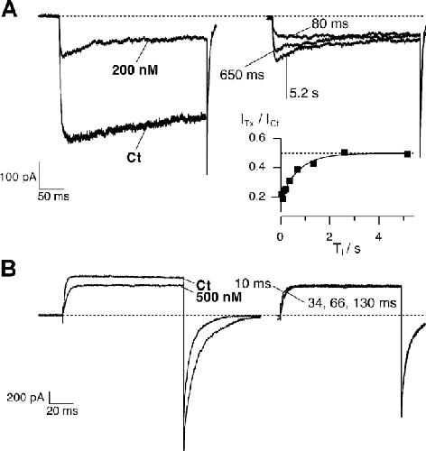 Figure 4. . Relaxation of κ-PVIIA binding to closed Shaker-Δ channels after a depolarizing pulse. Outside-out patch clamp experiments performed in symmetrical 115 mM KCl (A) or 115 mM RbCl (B; same experiment as in Fig. 2). Superimposed records of responses to double pulse stimulation before and after the addition to the bath respectively of 200 nM and 500 nM κ-PVIIA. Each stimulation consisted of a conditioning pulse to VP, followed with a variable pulse interval, Ti, by an identical test pulse: (A) duration conditioning pulse = 300 ms, VP = −20 mV, VH = −100 mV, Ti shown 80 and 680 ms, and 5.2 s; (B) duration conditioning pulse = 100 ms, VP = +40 mV, VH = −100 mV, Ti shown 10, 34, 66, and 130 ms. (A) Symmetrical 115 mM KCl. The conditioning pulse induces an increase of toxin block that appears as a hump in the first response; in the second response for small Ti values no peak is observed. (A, inset) Amplitude of the second response at early time normalized to the control response and plotted as a function of Ti. The continuous line is the best exponential fit with τ = 720 ms, and the dotted horizontal line corresponds to the asymptotic value of U = ITx/ICt = 0.50, giving KC = 200 nM. From U and τ from Eqs. 2 and 3, we estimate kCoff = 0.69 s−1 and kCon = 3.5 μM−1s−1. (B) Symmetrical 115 mM RbCl. The toxin equilibrates very fast with the closed state and 60 ms is enough to reach the equilibrium: the responses to the second pulse are indistinguishable after 66 ms. The process of toxin equilibration with the fraction of channels that are in the closed state has the same time scale of the deactivation process. Consequently, a kinetic analysis of the reblock is not possible.
