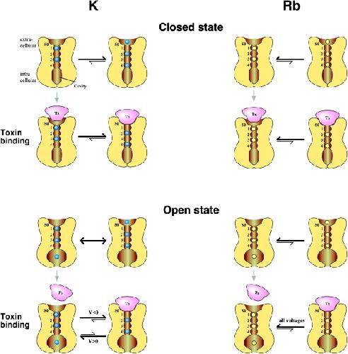 The x-ray structure of the KcsA channel at different [K(+)] and [Rb(+)] provided insight into how K(+) channels might achieve high selectivity and high K(+) transit rates and showed marked differences between the occupancies of the two ions within the ion channel pore. In this study, the binding of kappa-conotoxin PVIIA (kappa-PVIIA) to Shaker K(+) channel in the presence of K(+) and Rb(+) was investigated. It is demonstrated that the complex results obtained were largely rationalized by differences in selectivity filter occupancy of this 6TM channels as predicted from the structural work on KcsA. kappa-PVIIA inhibition of the Shaker K(+) channel differs in the closed and open state. When K(+) is the only permeant ion, increasing extracellular [K(+)] decreases kappa-PVIIA affinity for closed channels by decreasing the "on" binding rate, but has no effect on the block of open channels, which is influenced only by the intracellular [K(+)]. In contrast, extracellular [Rb(+)] affects both closed- and open-channel binding. As extracellular [Rb(+)] increases, (a) binding to the closed channel is slightly destabilized and acquires faster kinetics, and (b) open channel block is also destabilized and the lowest block seems to occur when the pore is likely filled only by Rb(+). These results suggest that the nature of the permeant ions determines both the occupancy and the location of the pore site from which they interact with kappa-PVIIA binding. Thus, our results suggest that the permeant ion(s) within a channel pore can determine its functional and pharmacological properties.