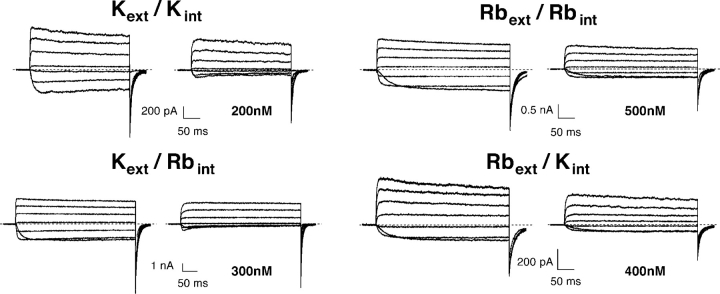 Figure 2. . κ-PVIIA block of Shaker currents in symmetric and asymmetric ionic Rb+ or K+ solutions. Current records in response to IV protocols (VH = −100 mV, VP from −50 mV to +70 mV, every 20 mV) recorded with outside-out patch clamp experiments in symmetrical 115 mM KCl (top left), symmetrical 115 mM RbCl (top right), Kext/Rbint (bottom left), and Rbext/Kint (bottom right) before and after the addition to the bath of κ-PVIIA (concentration indicated in the figure). The reversal potential is +5 mV in symmetrical 115 mM KCl, +3 mV in symmetrical 115 mM RbCl, +4 mV in Kext/Rbint, and −5 mV in Rbext/Kint.