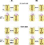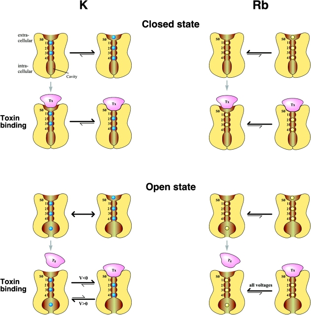Figure 5. . Cartoon of κ-PVIIA binding to Shaker K+ channels in the presence of Rb+ or K+. κ-PVIIA binding interacts differently with the ion(s)–channel complex depending on the state of the channel (top panel, closed state; bottom panel, open state) and on the pore occupancy of the permeant ion species (left panel, K+; right panel, Rb+). Ion binding sites within the selectivity filter are numbered from 1 to 4, while S0 is the extracellular binding site for K+. A detailed description is given in the Discussion.