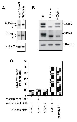 Figure 2. Reconstitution of XCdc7/XDbf4. (A) Whole Xenopus egg extract and chromatin isolated from interphase extract were immunoblotted with XDbf4, XCdc7 and XMcm7 antibodies. (B) Interphase Xenopus egg extracts were immunodepleted with antibodies against XDbf4 (XDbf4-) or XCdc7 (XCdc7-) antibodies or with an equal quantity of non-immune antibodies (NI-). Depleted extracts were immunoblotted with XDbf4, XCdc7 or XMcm7 antibodies. (C) Interphase extracts depleted with either XCdc7 antibodies or non-immune antibodies were supplemented with [α-32P]dATP and incubated for 2 hr with Xenopus sperm nuclei or licensed interphase chromatin, in the presence or absence of recombinant XDbf4 and/or XCdc7. After incubation, DNA synthesis was measured, and expressed as a percentage of that occurring in control extract.