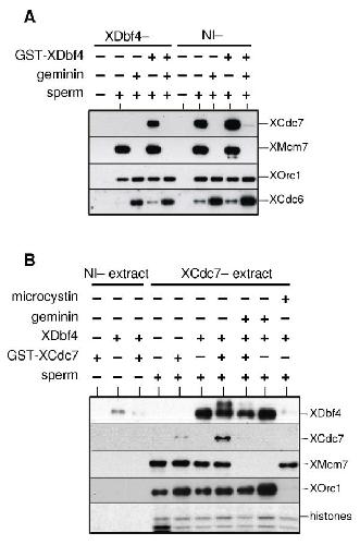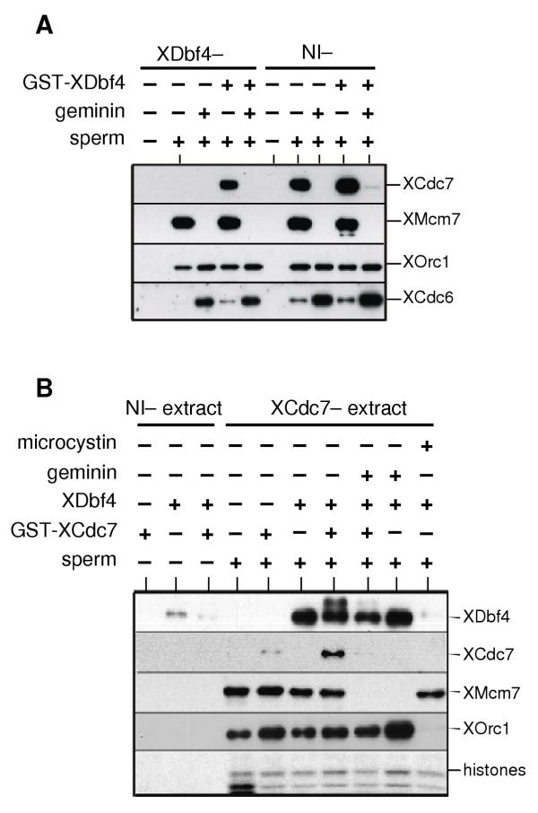 Figure 5. XCdc7 chromatin interaction requires XDbf4. (A) Sperm nuclei were incubated for 30 min in Xenopus interphase extract previously depleted with antibodies specific to XDbd4 (XDbf4-) or with non-immune serum (NI-), minus or plus added recombinant GST-XDbf4 protein, minus or plus geminin. Chromatin was then isolated and immunoblotted with antibodies specific for XCdc7, XMcm7, XOrc1 and XCdc6. (B) Sperm nuclei were incubated for 30 min in XCdc7-depleted extracts (XCdc7-) or non-immune depleted extracts (NI-) containing recombinant GST-XCdc7, recombinant XDbf4 previously treated with thrombin to remove the GST tag (XDbf4), recombinant geminin and/or microcystin. Incubation of recombinant proteins in non-immune depleted extract lacking sperm are shown as negative controls. Chromatin was then isolated and immunoblotted for XDbf4, XCdc7, XMcm7 and XOrc1.