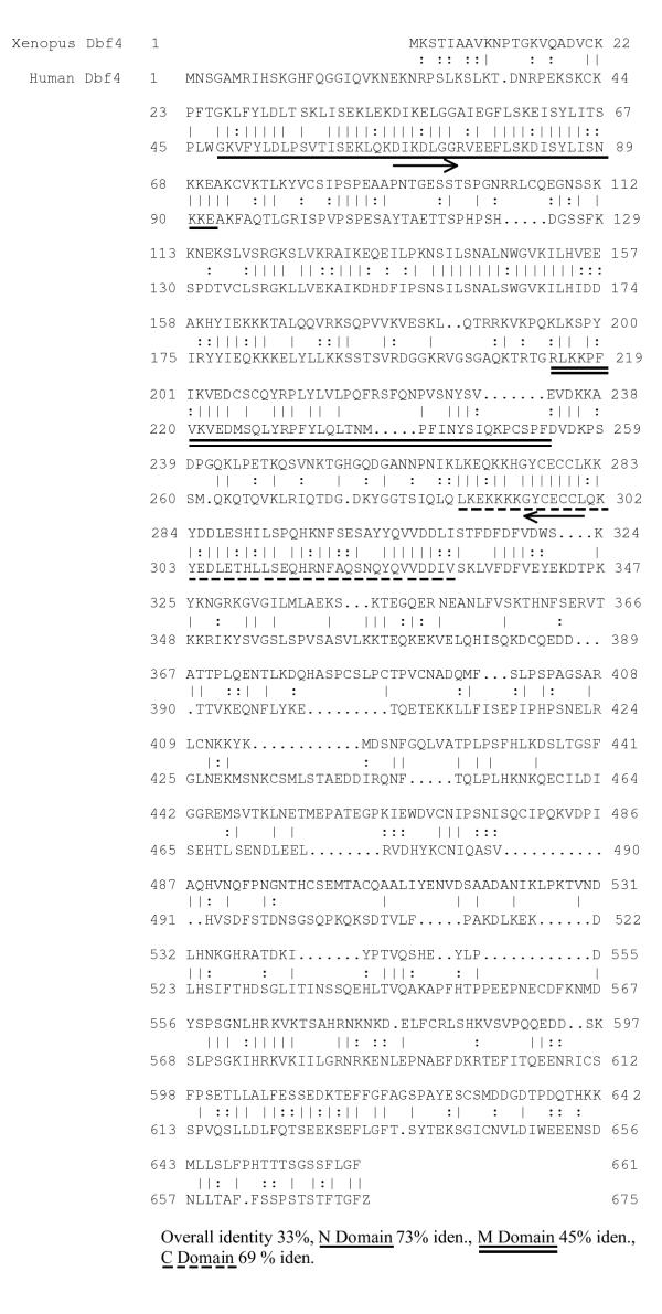 Figure 1. Amino acid sequence of XDbf4. Alignment of the full-length XDbf4 (GenBank accession number AY460183) and human Dbf4. The underlined, the double-underlined and the dash-underlined regions indicate the three conserved domains (N-, M- and C-domains). Arrows indicate the position of the two degenerate primers used for PCR amplification. The overall and the homology between domains are indicated.
