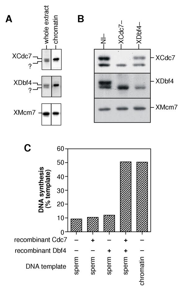 Early in the cell cycle a pre-replicative complex (pre-RC) is assembled at each replication origin. This process involves the sequential assembly of the Origin Recognition Complex (ORC), Cdc6, Cdt1 and the MiniChromosome Maintenance (Mcm2-7) proteins onto chromatin to license the origin for use in the subsequent S phase. Licensed origins must then be activated by S phase-inducing cyclin-dependent kinases (S-CDKs) and the Dbf4/Cdc7 kinase. We have cloned a Xenopus homologue of Dbf4 (XDbf4), the sequence of which confirms the results of Furukhori et al. We have analysed the role of XDbf4 in DNA replication using cell-free extracts of Xenopus eggs. Our results indicate that XDbf4 is the regulatory subunit of XCdc7 required for DNA replication. We show that XDbf4 binds to chromatin during interphase, but unlike XCdc7, its chromatin association is independent of pre-RC formation, occurring in the absence of licensing, XCdc6 and XORC. Moreover, we show that the binding of XCdc7 to chromatin is dependent on the presence of XDbf4, whilst under certain circumstances XDbf4 can bind to chromatin in the absence of XCdc7. We provide evidence that the chromatin binding of XDbf4 that occurs in the absence of licensing depends on checkpoint activation. We have identified XDbf4 as a functional activator of XCdc7, and show that it is required to recruit XCdc7 to chromatin. Our results also suggest that XCdc7 and XDbf4 are differentially regulated, potentially responding to different cell cycle signals.