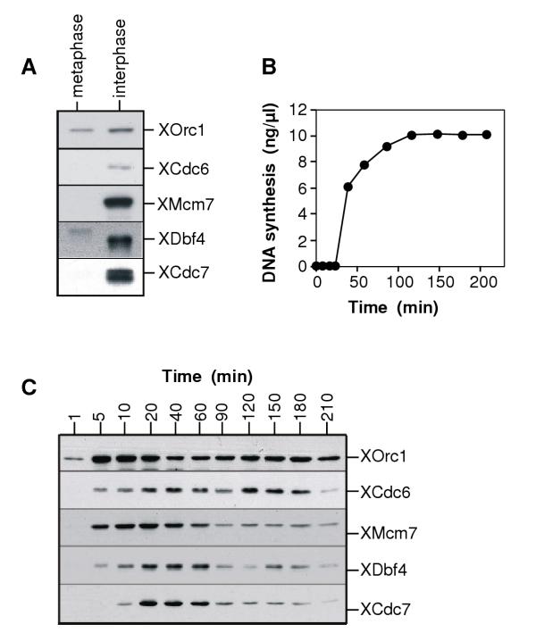 Figure 3. The association of XDbf4 with chromatin differs from that seen with XCdc7. (A) Xenopus sperm nuclei were incubated in metaphase or interphase extract for 30 min. Chromatin was isolated and immunoblotted with antibodies specific for XOrc1, XDbf4, XCdc7, XMcm7 and XCdc6. (B, C) Sperm nuclei were incubated at 10 ng/μl in interphase Xenopus egg extract. At the indicated times, (B) samples were assayed for DNA synthesis by [α-32P]dATP incorporation, or (C) chromatin was isolated and immunoblotted with antibodies specific for XOrc1, XCdc6, XMcm7, XDbf4 and XCdc7.