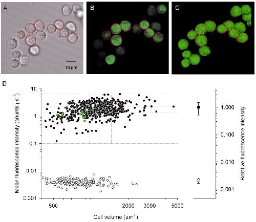 Fig.1. Fluorescence intensity and volumes of CHO cells expressing EGFP. (A) Transmission image of pDP3 cells. (B) Fluorescence intensity of the cells in A, measured with the CLSM; this image is the average of two successive x-y scans taken at the z-level where the apparent cell diameters were maximal. (C) Three-dimensional surface renderings of the cells of panels A and B, from the viewpoint of the objective in the inverted microscope, and presenting for each cell an iso-intensity surface at a level â¼3% of the maximum fluorescence. (D) Mean fluorescence intensity of 485 pDP3 cells (â¢) and 193 non-expressing control CHO cells (â), plotted as a function of the cell volume. The green filled symbols plot the data of the cells illustrated in panels A-C. The symbols to the right give the mean±s.d. of each population, scaled relative to the mean of the pDP3 cell fluorescence. The dashed lines show the boundaries of 15 bins into which the data were pooled to examine dependencies of the estimated aqueous volume fraction on cell volume and EGFP levels.