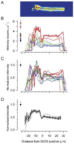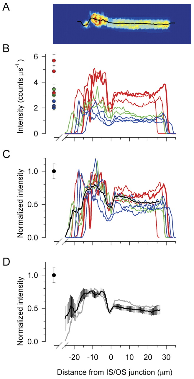 Fig.4. Quantification of the spatial distribution of EGFP in living Xenopus rods. (A) EGFP distribution in a single rod. The voxels corresponding to the rod identified in Fig. 3B (white arrow) were excised from the stack of 2D CLSM scans, and projected onto a plane parallel to the OS axis: the panel is a false-color representation of the fluorescence distribution in the average of three scans spanning a thickness of 1.5 μm. The black line through the image is the automatically determined `z-spline' path through the cell's core along which a fluorescence intensity profile was computed. (B) Fluorescence intensity profiles of 8 rods from the piece of retina illustrated in Fig. 3, segregated with colors to indicate different levels of fluorescence: red for most intense, green for mid-level and blue for least intense (the profile of the rod of panel A is identified with a thickened red line). Panels A and B are aligned on the abscissa, and the profiles of all rods have been aligned at the junction between the IS and OS (x=0). The colored symbols at the left give the mean (±s.d.) fluorescence of the voxels of the entire IS of each rod having the top 5th percentile of intensities (comprising, on average, 460 voxels per rod). In the OS region the spline goes through the center or `core' of the rod discs, whereas in the IS the spline randomly encounters high and low fluorescence voxels. (C) The profile distribution of each rod in panel B has been normalized by the value of the corresponding colored circle plotted at the left of the graph. The thickened black line plots the average of the normalized intensity profiles of the 15 rods `cut' from the piece of retina illustrated in Fig. 3. The black symbol to the left represents the normalization value (unity), and the error bar gives the average coefficient of variation (s.d./mean) of the top 5th percentile of voxels of the inner segments of the 15 rods. (D) Grand average normalized intensity distributions of rods expressing EGFP. Data such as shown in panel C were pooled from 57 rods whose profiles were extracted from CLSM scans of 11 pieces of retina from 5 Xenopus tadpoles and froglets ranging from 4 weeks to 9 months of age. Error bars are 95% confidence intervals. (The average trace from panel C is shown in light gray for comparison.)