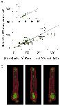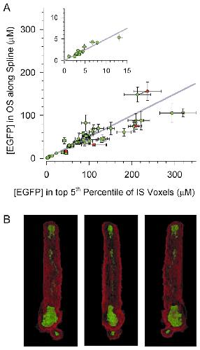 Fig.5. Quantitative test of the EGFP equilibration hypothesis in Xenopus rod cells. (A) Each point gives the average concentration of EGFP in a rod OS derived from a profile analysis such as illustrated in Fig. 5A,B, plotted as a function of the maximal concentration of EGFP in the rod IS. The gray lines have a slope of G and plot the prediction of the EGFP equilibration hypothesis that the OS should exhibit 50% of the fluorescence intensity of the brightest voxels of the IS. The inset shows the distribution in the lowest corner of the main plot, i.e. the initial 15 μM of the abscissa on an expanded scale. The red circles plot scan data of cells after a complete bleaching exposure; pre-bleach scans of the same cells were unchanged. (B) Display of the brightest 5% of the voxels (green) and the dimmest 5% (red) of the rod identified by the arrow in Fig. 3B; three orientations of the rod are provided. Autofluorescence levels of control rods were comparable with those of CHO cells (Fig. 1D) under our experimental conditions, and thus negligible in comparison with cells having average [EGFP] in the micromolar range.