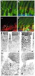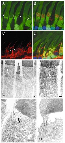 Fig.8. Xenopus rod aqueous spaces revealed by EGFP and confirmed by immunohistochemical labeling of cytochrome c and α-tubulin, and by EM. (A) Confocal image of transverse frozen section of retina with only the EGFP channel activated. Arrows point to bright dots that localize just below the OS, which align with a green line that projects up the OS. (B) Same section as in A, showing immunostaining of cytochrome c (red) and the nucleus with DAPI (blue). The green fluorescence in the same location as the DAPI labeling shows EGFP to be present in the nucleus. Note the presence of three cone nuclei (deep blue) which show no green labeling; these cones give rise to dark regions in the images of A and B. (C) Confocal image of transverse frozen section labeled with antibody against acetylated α-tubulin (red), which identifies the cilium and axonemes of two rods (arrows) and two cones (no arrows). (D) Same image as in C, but with the EGFP channel activated: the bright green dots are seen to localize at the projection of the axoneme to the top of the ellipsoid region. The EGFP channel is relatively less intense than in A and B because some of the protein is lost owing to the use of Triton to enable the antibody access to α-tubulin (Kaplan et al., 1987). When z-stacks of such confocal images are scanned, every single rod shows the features illustrated in these panels. (E-H) Montage of EM images of the ellipsoid and basal disc region of Xenopus rods: in these panels one can see a region devoid of mitochondria immediately surrounding the basal body of the cilium (arrows). Scale bars, 1 μm.