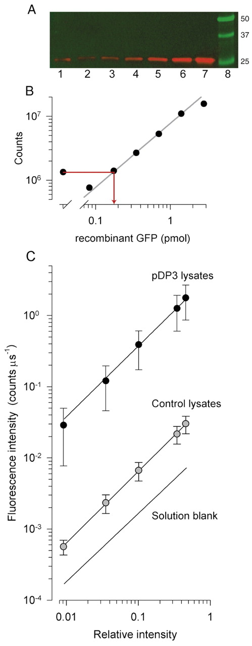 Fig.2. (A) Quantitation of EGFP mass per CHO cell with western blotting and fluorimetry. Immunofluorescence of a gel stained with primary antibody against GFP. Lane 1 (red band) was injected with the lysate of 5Ã104 pDP3 cells, while lanes 2-7 contained incremented amounts of recombinant EGFP; lane 8 (green bands), molecular size calibration. (B) Fluorescence intensity of the bands of the gel in A as a function of loaded protein: each point corresponds to the intensity of the lane above it. The line is a least squares regression line fitted to the points in the linear range of the blot. The protein mass in the pDP3 lysate band (lane 1) is estimated from the projection of the band intensity (leftmost circle) onto the regression line, yielding for this experiment 0.2 pmols, or 4.0 amols per cell. (C) Fluorimetric analysis of cell lysates. Lysates of 106 pDP3 or non-expressing control cells in 100 μl of non-denaturing buffer were scanned in the CLSM in the same manner as recombinant EGFP (see Materials and Methods). Filled symbols show fluorescence (mean±s.d.) of lysates: â¢, pDP3 cells (n=12 scans of 8 different lysates); , non-expressing cells (n=7 lysates). The unity slope regression line through the pDP3 lysate data corresponds to 57 nM recombinant EGFP, yielding 5.7 pmols total mass, or 5.7 amols/cell, in good correspondence with the value 5.4±1.1 amols/cell obtained from averaging estimates from regression analysis of the lysates of the 12 experiments.