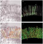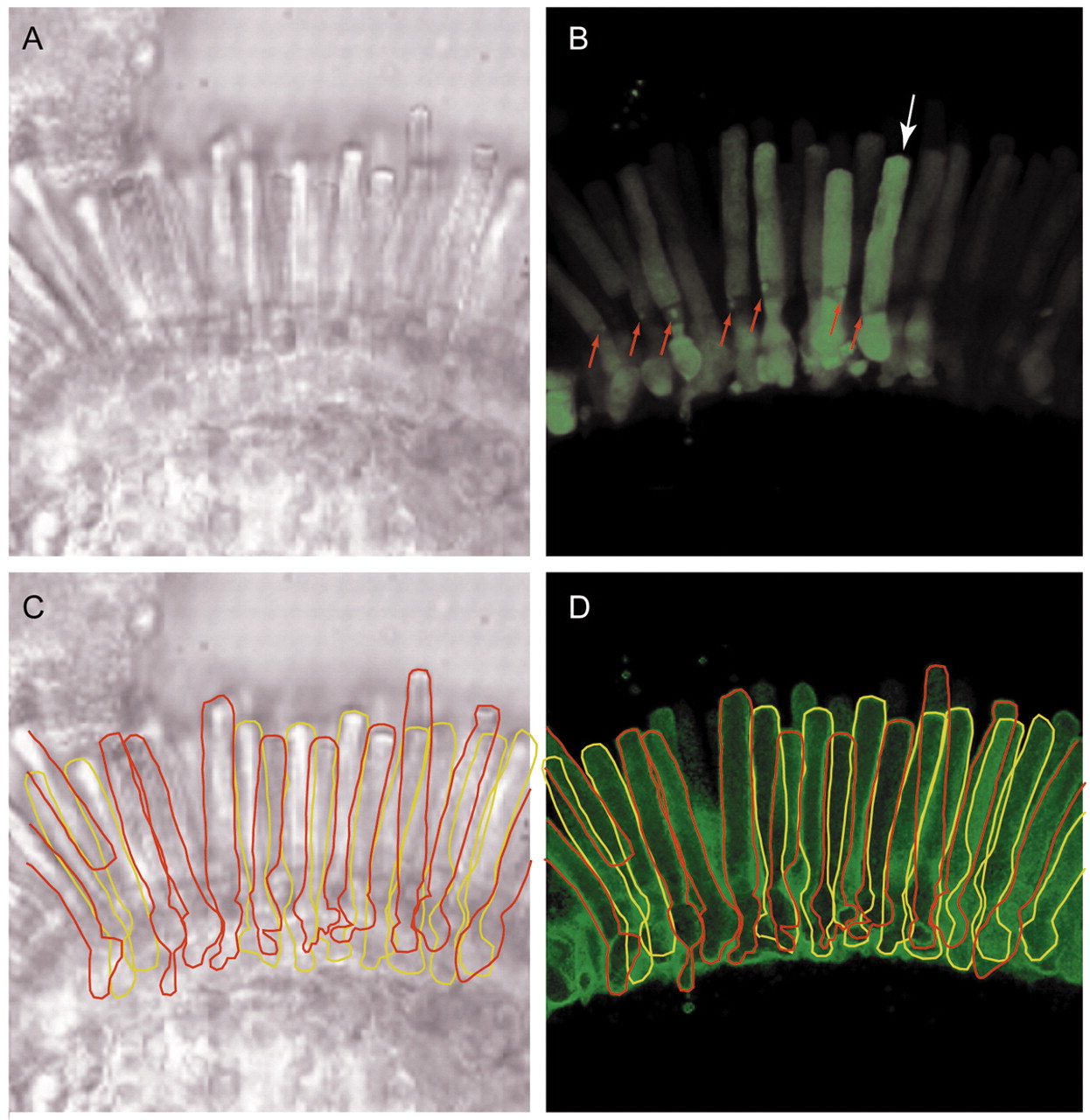 Fig.3. Features of rod cells expressing EGFP. (A) Transmission image of a small piece of Xenopus retina in the recording chamber. (B) Three-dimensional rendering of CLSM scans of the piece of retina shown in A. The scan data are displayed using a linear gradient over the lower 50% of the fluorescence range to enhance visibility of weakly fluorescing rods. (The rod identified by the arrow in B is singled out for further analysis in Fig. 4A. The red arrows point to a small area of high fluorescence, a feature examined in Fig. 6.) (C,D) An outline of each rod identified in the 3D rendering was made: rods nearer the chamber floor have been outlined in red, while those further back in the stack have been outlined in yellow. In panel C these outlines have been superimposed on the transmission micrograph, illustrating the correspondence between the two images.