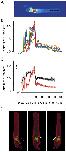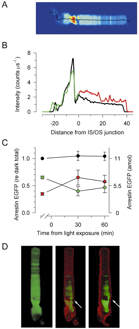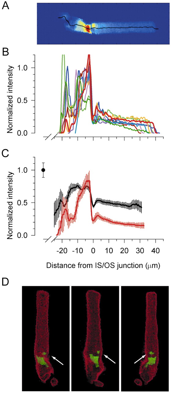 Fig.6. Distribution of Arr-EGFP in dark adapted rods. (A) Pseudocolor representation of the distribution of Arr-EGFP in a dark-adapted rod. (B) Profile distributions along splines of the rod of panel A (thickened red trace), along with those of nine other rods from the same piece of retina, scaled by the intensity of the voxels of the inner segment having the top 5% fluorescence intensity. (C) Average fluorescence distributions (red trace) of Arr-EGFP in 15 rods from two animals compared with the average distribution of EGFP (black trace; cf. Fig. 4D); error bars are 95% confidence intervals. (D) Three-D rendering of the rod in A in which the dimmest 5% of the voxels are shown in red, whereas the 5% most intensely fluorescing voxels are shown in green.