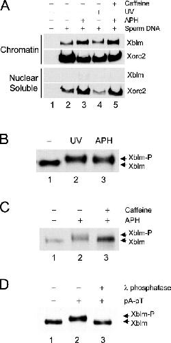 Figure 1. Xblm binds to chromatin and becomes phosphorylated in a checkpoint-dependent manner. (A) Extracts were incubated with no sperm chromatin (lane 1), untreated sperm chromatin (lane 2), sperm chromatin plus 100 μg/ml aphidicolin (APH; lane 3), UV-damaged sperm chromatin (lane 4), or sperm chromatin plus aphidicolin and caffeine (lane 5). After 90 min, nuclei were isolated and separated into nuclear soluble and chromatin fractions. The fractions were immunoblotted for Xblm and Xorc2 (as a loading control). (B) Extracts were incubated for 90 min with untreated sperm chromatin (lane 1), UV-damaged sperm chromatin (lane 2), or sperm chromatin plus aphidicolin (lane 3). Whole nuclear fractions were immunoblotted for Xblm. (C) Extracts were incubated with sperm chromatin alone (lane 1), sperm chromatin plus aphidicolin (lane 2), or sperm chromatin plus aphidicolin and caffeine (lane 3). Nuclear fractions were immunoblotted for Xblm. (D) Anti-Xblm immunoprecipitates from extracts containing no DNA (lane 1) or pA-pT (lanes 2 and 3) were incubated without (lanes 1 and 2) or with (lane 3) λ phosphatase and were immunoblotted for Xblm.
