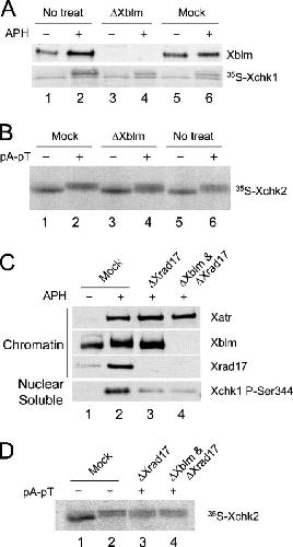 Figure 3. Xblm is not required for the checkpoint-dependent phosphorylation of Xchk1 or Xchk2. (A) Untreated (lanes 1 and 2), Xblm-depleted (lanes 3 and 4), and mock-depleted (lanes 5 and 6) egg extracts containing 35S-labeled Xchk1 were incubated for 90 min in the absence or presence of aphidicolin. Nuclear fractions were isolated and immunoblotted for Xblm or were examined for phosphorylation of 35S-labeled Xchk1 by SDS-PAGE and phosphorimaging. (B) Extracts were treated with control antibodies (lanes 1 and 2), anti-Xblm antibodies (lanes 3 and 4), or no antibodies (lanes 5 and 6). 35S-labeled Xchk2 was incubated in these depleted extracts for 90 min in the absence or presence of pA-pT. 35S-labeled Xchk2 in the whole-egg extracts was examined by phosphorimaging. (C) Extracts were treated with control antibodies (lanes 1 and 2), anti-Xrad17 antibodies (lane 3), or both anti-Xrad17 and anti-Xblm antibodies (lane 4). Extracts were incubated with sperm chromatin in the absence (lane 1) or presence (lanes 2–4) of aphidicolin. Chromatin fractions were immunoblotted for Xatr, Xblm, and Xrad17. Phosphorylation of Xchk1 in the soluble nuclear fraction was detected with anti-P-Ser344 antibodies. (D) Extracts were treated with control (lanes 1 and 2), anti-Xrad17 (lane 3), or both anti-Xrad17 and anti-Xblm (lane 4) antibodies. Phosphorylation of 35S-labeled Xchk2 after incubation in the absence (lane 1) or presence (lanes 2–4) of pA-pT in egg extracts was examined.