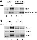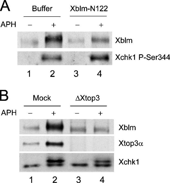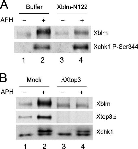 Figure 6. Phosphorylation of Xblm depends on association with Xtop3α. (A) Buffer alone (lanes 1 and 2) or Xblm-N122 (100 μg/μl; lanes 3 and 4) was added to extracts lacking (lanes 1 and 3) or containing (lanes 2 and 4) aphidicolin. After 90 min, nuclear fractions were isolated and immunoblotted with antibodies against Xblm and P-Ser344 of Xchk1. (B) Mock-depleted (lanes 1 and 2) and Xtop3α-depleted (lanes 3 and 4) extracts were incubated with sperm chromatin in the absence (lanes 1 and 3) or presence (lanes 2 and 4) of aphidicolin. After 90 min, nuclear fractions were isolated and immunoblotted with antibodies against Xblm, Xtop3α, and the whole Xchk1 protein.