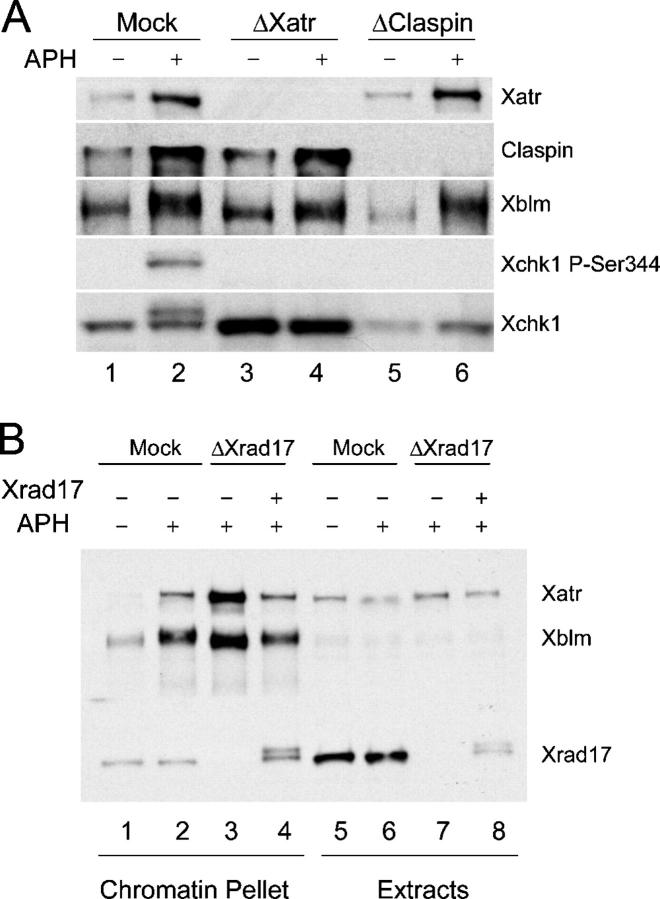 Figure 2. Xatr and Xrad17, but not Claspin, are required for phosphorylation of Xblm. (A) Extracts were treated with control (lanes 1 and 2), anti-Xatr (lanes 3 and 4), or anti-Claspin (lanes 5 and 6) antibodies. Sperm chromatin was incubated in extracts for 90 min in the absence (lanes 1, 3, and 5) or presence (lanes 2, 4, and 6) of aphidicolin. Nuclear fractions were isolated and immunoblotted for Xatr, Claspin, Xblm, Xchk1, and P-Ser344 of Xchk1. (B) Extracts were treated with control (lanes 1, 2, 5, and 6) or anti-Xrad17 (lanes 3, 4, 7, and 8) antibodies. Sperm chromatin was incubated in extracts for 90 min in the absence (lanes 1 and 5) or presence (lanes 2–4 and 6–8) of aphidicolin. His6-Xrad17 was added back to some extracts (lanes 4 and 8). Chromatin fractions and whole-extract aliquots were immunoblotted for Xatr, Xblm, and Xrad17.