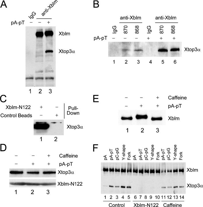 Figure 4. Xblm interacts with Xtop3α in a regulated manner. (A) Control (lane 1) and anti-Xblm (lanes 2 and 3) antibodies on protein A beads were incubated in extracts in the absence (lanes 1 and 2) or presence (lane 3) of pA-pT. The beads were collected and immunoblotted for Xblm and Xtop3α. (B) Control antibodies (lanes 1 and 4) and two different anti-Xblm antibodies (#870, lanes 2 and 5; #868, lanes 3 and 6) on protein A beads were incubated in extracts in the absence (lanes1–3) or presence (lanes 4–6) of pA-pT. The beads were collected and immunoblotted for Xtop3α. (C) His6-tagged Xblm-N122 on nickel beads and blank nickel beads were incubated in interphase egg extracts. The beads were collected and immunoblotted for Xtop3α. (D) Xblm-N122 on nickel beads was incubated in extracts containing no DNA (lane 1), pA-pT (lane 2), or pA-pT plus caffeine (lane 3). The beads were collected and immunoblotted with anti-Xtop3α and anti-His6 antibodies (to detect Xblm-N122). (E) Egg extracts were incubated with no DNA (lane 1), pA-pT (lane 2), or pA-pT plus caffeine (lane 3) and were immunoblotted for Xblm. (F) Anti-Xblm antibodies on protein A beads were incubated in extracts in the presence of different oligonucleotides. In some cases, either purified Xblm-N122 (lanes 6–10) or caffeine (lanes 11–14) was also added. After 2 h, the beads were collected and immunoblotted for Xblm and Xtop3α.