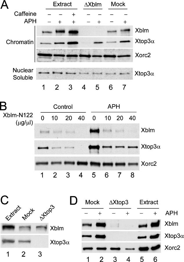Figure 5. The NH2-terminal 122 amino acids of Xblm are involved in the interaction with Xtop3α on chromatin. (A) Extracts were treated with no antibodies (lanes 1–3), anti-Xblm antibodies (lanes 4 and 5), or control antibodies (lanes 6 and 7) and then incubated with sperm chromatin alone (lanes 1, 4, and 6), sperm chromatin plus aphidicolin (lanes 2, 5, and 7), or sperm chromatin plus aphidicolin and caffeine (lane 3). After 90 min, nuclear fractions were isolated and separated into chromatin and nuclear soluble fractions. These fractions were immunoblotted for Xblm, Xtop3α, and Xorc2. (B) The NH2-terminal 122 amino acids of Xblm are required for interaction with Xtop3α on chromatin. Egg extracts containing sperm chromatin were incubated in the absence (lanes 1–4) or presence (lanes 5–8) of aphidicolin. The extracts were also treated without (lanes 1 and 5) or with (10–40 μg/μl; lanes 2–4 and 6–8) Xblm-N122. After 90 min, chromatin fractions were immunoblotted for Xblm, Xtop3α, and Xorc2. (C) Extracts were treated with no antibodies (lane 1), control antibodies (lane 2), or anti-Xtop3α antibodies (lane 3) and were immunoblotted for Xblm (top) and Xtop3α (bottom). (D) Mock-depleted extracts (lanes 1 and 2), Xtop3α- depleted extracts (lanes 3 and 4), and extracts treated with no antibodies (lanes 5 and 6) from C were incubated with sperm chromatin in the absence (lanes 1, 3, and 5) or presence (lanes 2, 4, and 6) of aphidicolin. Chromatin fractions were isolated and immunoblotted for Xblm, Xtop3α, and Xorc2.