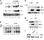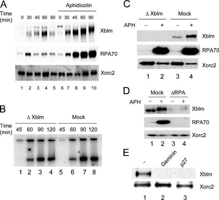Figure 7. Xblm associates with replicating chromatin, but is not essential for DNA replication. (A) Sperm chromatin was incubated in egg extracts in the absence (lanes 1â5) or presence (lanes 6â10) of aphidicolin. At various times, chromatin fractions were isolated and immunoblotted for Xblm, RPA70, and Xorc2. (B) Xblm-depleted (lanes 1â4) and mock-depleted (lanes 5â8) egg extracts were incubated with sperm chromatin. Chromosomal DNA replication was assayed as described in the Materials and methods. The two bands in each lane depict 32P incorporation into chromosomal DNA. (C) Xblm-depleted (lanes 1 and 2) and mock-depleted (lanes 3 and 4) extracts were incubated with sperm chromatin in the absence (lanes 1 and 3) or presence (lanes 2 and 4) of aphidicolin. Chromatin fractions were isolated and immunoblotted for Xblm, RPA70, and Xorc2. (D) Mock-depleted (lanes 1 and 2) and RPA70-depleted (lanes 3 and 4) extracts were incubated with sperm chromatin in the absence (lanes 1 and 3) or presence (lanes 2 and 4) of aphidicolin. Chromatin fractions were isolated and immunoblotted for Xblm, RPA70, and Xorc2. (E) Extracts were left untreated (lane 1) or were treated with either geminin (lane 2) or p27 (lane 3) as described previously (Lee et al., 2003), and sperm chromatin was added. After 90 min, chromatin fractions were immunoblotted for Xblm (top) and Xorc2 (bottom).