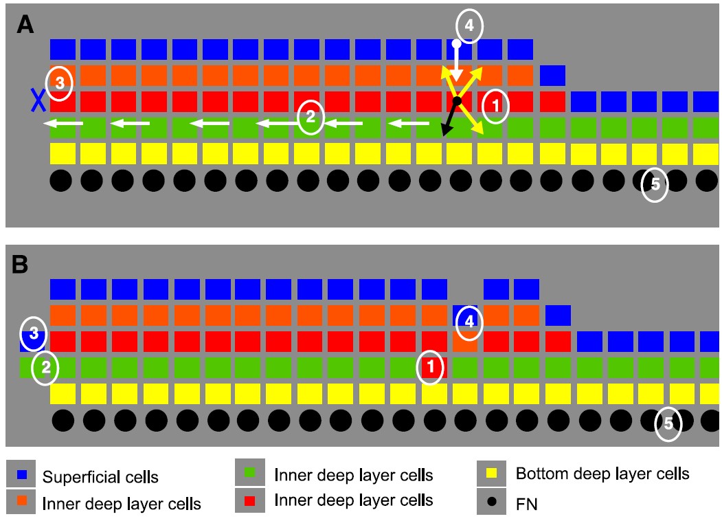 diameter to the left, (3) the superficial cell layer extends (spreads) to cover the protruding green cell layer, (4) an orange deep cell drops down to fill the gap