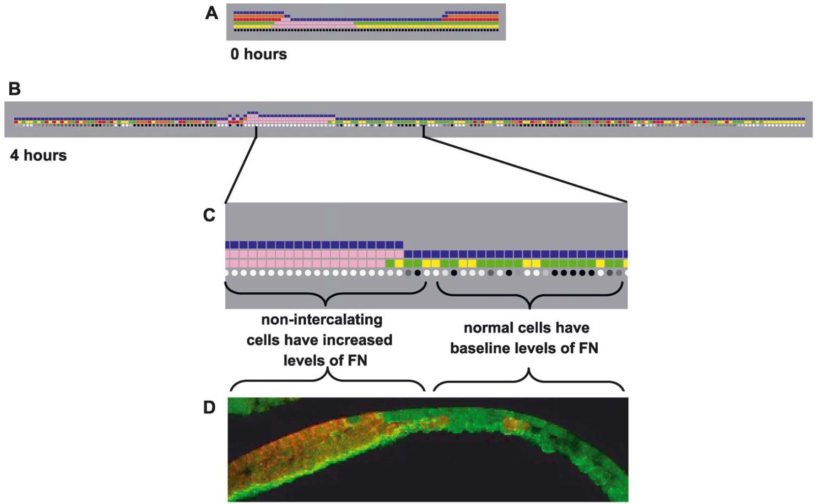 In the blastocoel roof (BCR) of the Xenopus laevis embryo, epibolic movements are driven by the radial intercalation of deep cell layers and the coordinate spreading of the overlying superficial cell layer. Thinning of the lateral margins of the BCR by radial intercalation requires fibronectin (FN), which is produced and assembled into fibrils by the inner deep cell layer of the BCR. A cellular automata (CA) computer model was developed to analyze the spatial and temporal movements of BCR cells during epiboly. Simulation parameters were defined based on published data and independent results detailing initial tissue geometry, cell numbers, cell intercalation rates, and migration rates. Hypotheses regarding differential cell adhesion and FN assembly were also considered in setting system parameters. A 2-dimensional model simulation was developed that predicts BCR thinning time of 4.8 h, which closely approximates the time required for the completion of gastrulation in vivo. Additionally, the model predicts a temporal increase in FN matrix assembly that parallels fibrillogenesis in the embryo. The model is capable of independent predictions of cell rearrangements during epiboly, and here was used to predict successfully the lateral dispersion of a patch of cells implanted in the BCR, and increased assembly of FN matrix following inhibition of radial intercalation by N-cadherin over-expression.