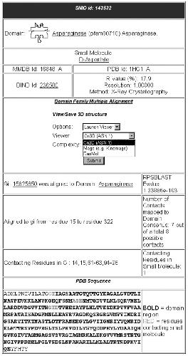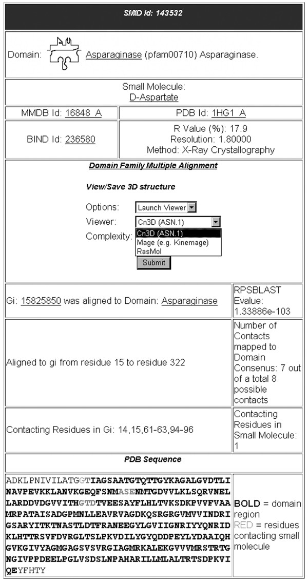 Figure 1. SMID record as viewed from the SMID web interface. This record was derived from PDB entry 1HG1, which shows an interaction between an Asparaginase domain (residues 15–322 of chain A, identified by RPS-BLAST with an E-value of 1.34e-103) and D-Aspartate. The GI for 1HG1 chain A is 15825850. For the SMID record shown, seven of the eight residues of the binding site are located within the Asparaginase domain.