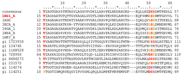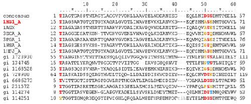 Figure 3. A CDD domain family multiple alignment. All sequences from a CDD domain family are listed including the consensus. In addition, the sequence for the PDB protein from which the SMID interaction was derived is included, with its PDB code highlighted in red. Lowercase residues do not align with the consensus and represent insertions or deletions relative to the consensus. Small molecule binding site residues are mapped to the domain family sequences from the parent PDB sequence using the following colour-coding scheme: red for conserved residues, blue for similar residues and yellow for non-conserved residues. In cases where a binding site aligns to a gap in the consensus, conservation cannot be measured and thus no coloured residue is displayed. Note that some binding site residues may be highlighted in addition to those associated with the parent PDB sequence if there are redundant interactions from other PDB files with a similar binding site. This alignment has been truncated for clarity.