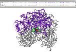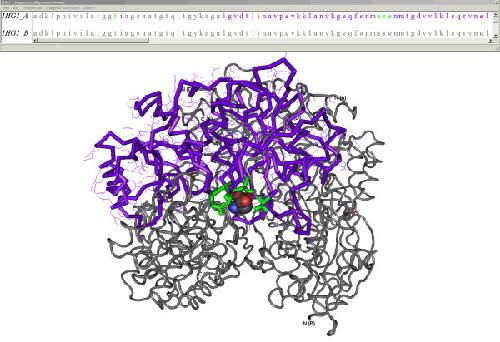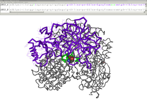 Figure 4. A 3-D SMID interaction. The x-ray crystallographic structure of Erwinia chrysanthemi L-Asparaginase associating with D-Aspartate (PDB ID: 1HG1), as viewed by Cn3D. The structure was annotated by SMID to highlight the domain residues (purple), domain residues contacting the D-Aspartate molecule (green) and the non-domain residues (grey). The D-Aspartate small molecule ligand is shown in space-fill format. The sequence/alignment viewer provides sequences for all chains found in the PDB record. For the sequence involved in the small molecule interaction, residues are colour-coded using the same scheme seen in the structural model.