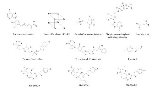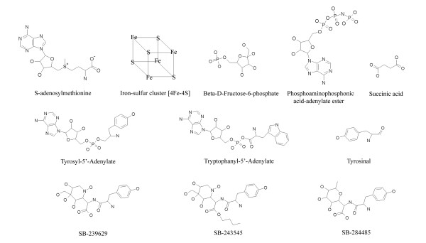 Figure 6. Selected chemical structures. Chemical structures of selected SMID-BLAST small molecule hits from query proteins MiaB, Phosphoglycerate Mutase, TrpRS and TyrRS.